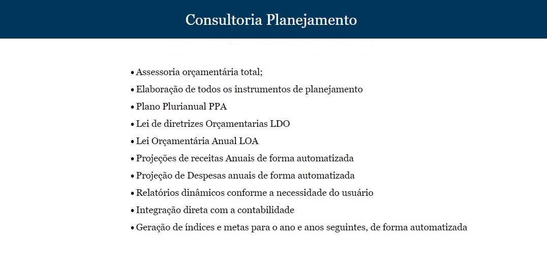 Prestação de serviços em assessoria no Planejamento e Orçamento dos Municípios.
