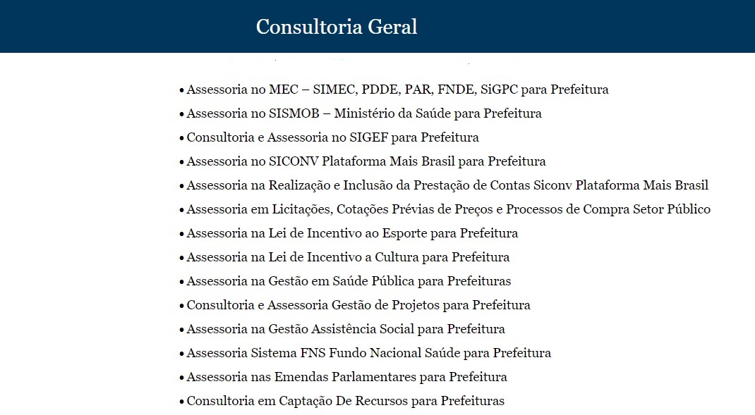 Assessoria e Consultoria para todas as áreas Municipais.
